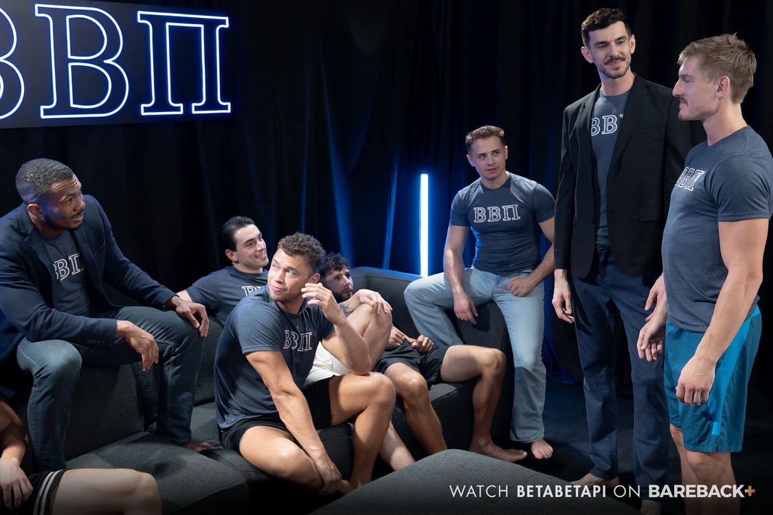 Hunter opens both holes wide. Shane takes his mouth, Sean takes the rear, sinking his huge black cock inch by inch, bottoming out against the diver’s perfect ass and making him moan as Sean’s hairy balls press against his own. Brother Tanner Valentino pushes Shane aside and continues the spit-roasting by using the slut’s mouth to wet his dick and clean his nuts. Sean pulls out and Shane taps in, dicking the freshly fucked hole. While his ass is being pummeled, Hunter watches as the gangbang transitions into full BROrgy mode. Each man’s cock now controls his mind, and they must fuck. Any hole. Any mouth. Hunter sees Brother Cody Seiya bending over as hairy muscle stud Brother Felipe Eduardo pushes his uncut cock in dry. Tanner begins fucking tattooed stud, Brother Vincent O’Reilly, who’s mouth was slurping every inch of Brother Dean Walker and seated in the corner, Sean’s hands were overflowing with Brother Jake Mathews beefy muscle cakes, slowly lowering him down onto his cock. Hunter’s eyes were suddenly blocked by a thick black bush, as Brother Guy pushed his dick into his mouth. The sounds of wet holes being fucked and throats being used encouraged the house to fall deeper into a fuck-trance. Grunts and moans became applause. Guy’s cock fell from Hunter’s mouth just as Felipe and Tanner “eiffel tower” Cody. Guy lays down on the ottoman and allows Hunter to bounce up and down his huge member. The well used hole was a little too loose for Guy’s liking and invited Tanner to push in alongside him to tighten things up.