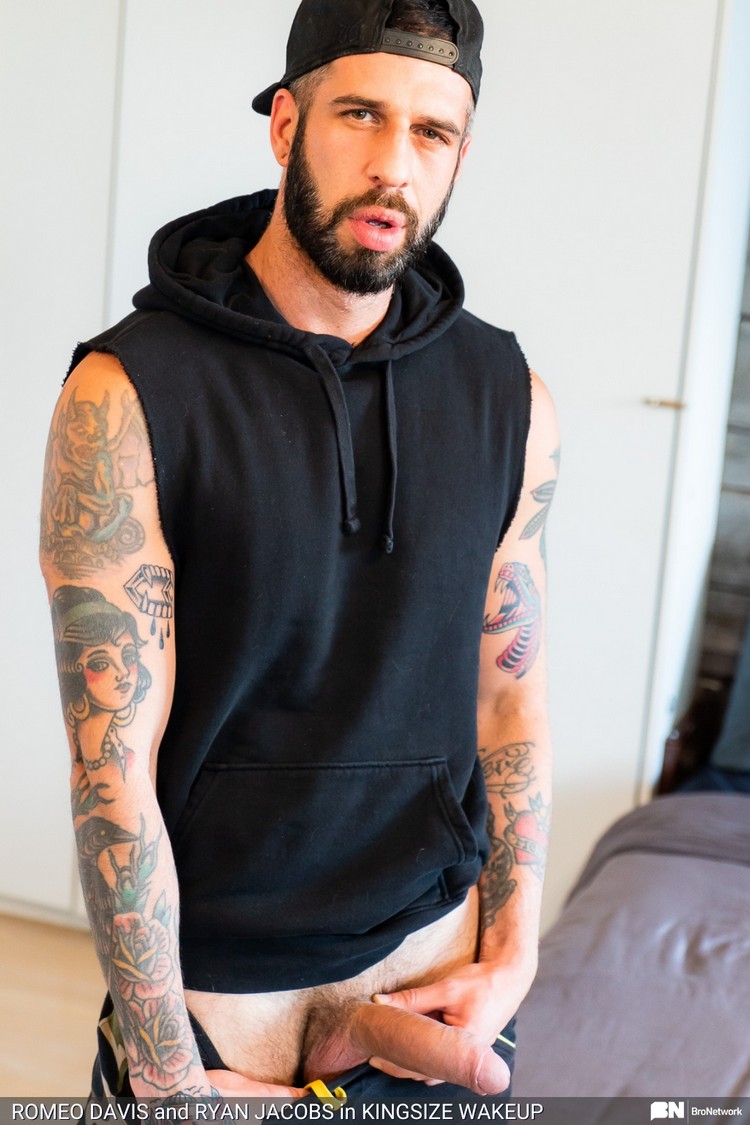 Romeo wakes Ryan up with a twitch of the arm, and ever-horny Ryan knows exactly what his king-size stud has in mind. A quick lick of the nipple leads into a hot bareback fuck. Ryan takes every inch of Romeo’s thick cock and ends up drenched in cum once again. Is there a better way to start your morning than a hot fuck?