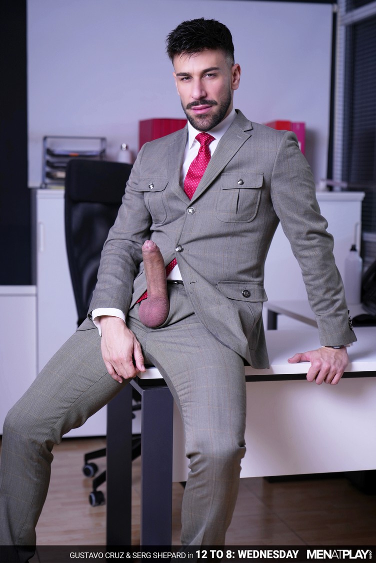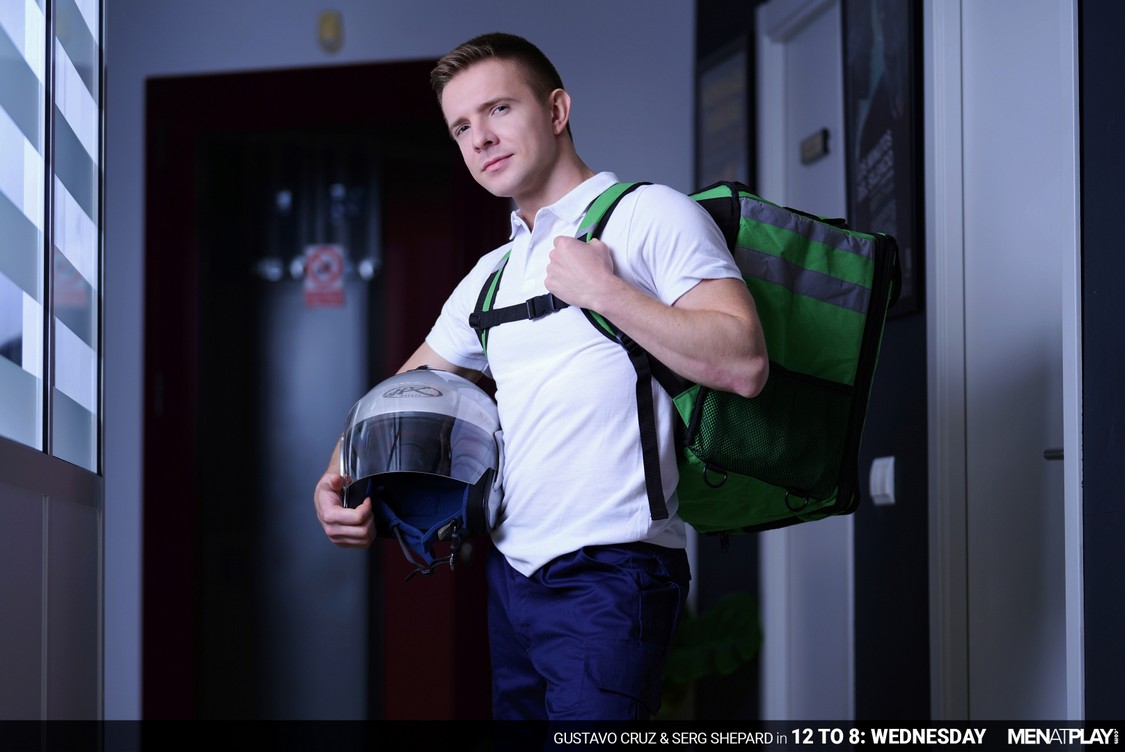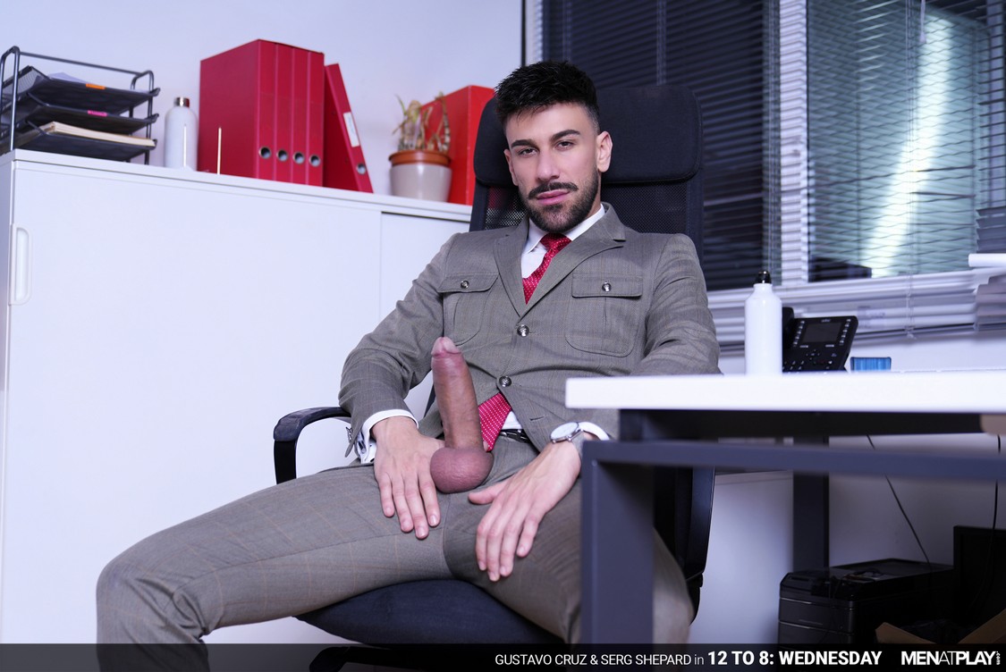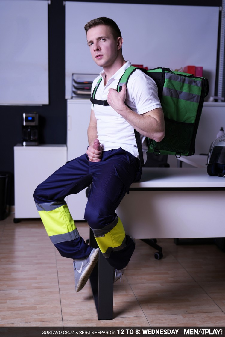 The MAP offices are open 24 hours a day, year-round, and Gustavo Cruz, Head of Global Marketing, typically works the graveyard shift: 12 AM to 8 AM. A few hours into his workday, Gustavo places a food order for delivery to the MAP offices in Tower B’s 3rd floor. Thirty minutes or so later, Gustavo receives a text from the deliveryman (Serg Shepard) that his order has arrived and he’s at reception. When Gustavo goes to pay, he realizes that he has left his wallet at his desk and asks Serg to follow him. But when they arrive at Gustavo’s office, he closes the door and lowers the blinds. The suited (and horny) executive decides to skip dinner… and go straight for dessert. And lucky for him, the deliveryman is open to providing it as long as the tip is excellent. Serg is in for a big surprise, literally! Gustavo pulls out his monster cock through his pant fly and has it sucked. And, it’s only fair that he return the favor to the blue-collar worker, whose cock is rock hard. Ready for some peach, Gustavo bends Serg over his chair and eats and fingers his smooth hole. When Serg is ready to take it like a man, Gustavo shows his raw XXL cock deep inside, filling him completely. While getting fucked on his back on the office desk, Serg’s prostate cannot resist the hot pounding he’s getting and shoots his load. Gustavo follows shortly, spraying his cum over Serg’s athletic stomach and then putting it inside him. Just another day at the office. Call again when you get hungry!