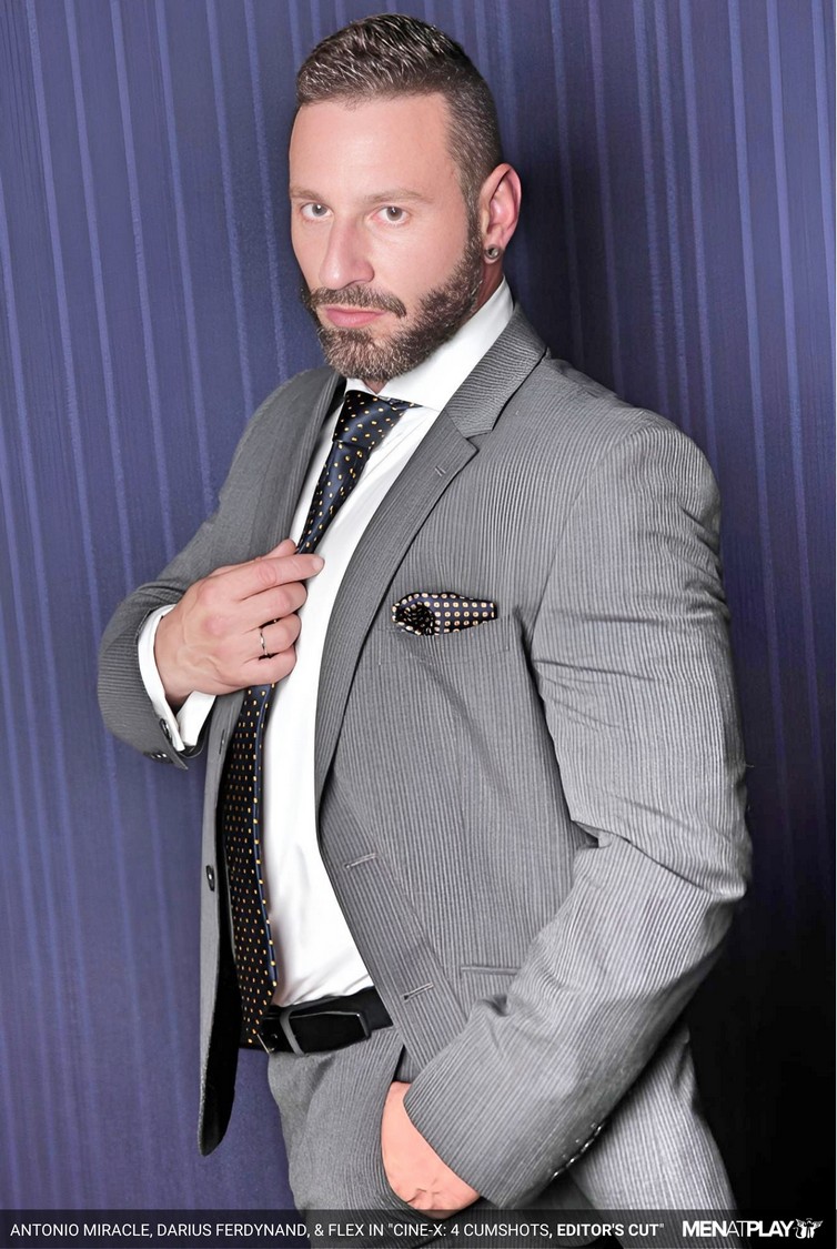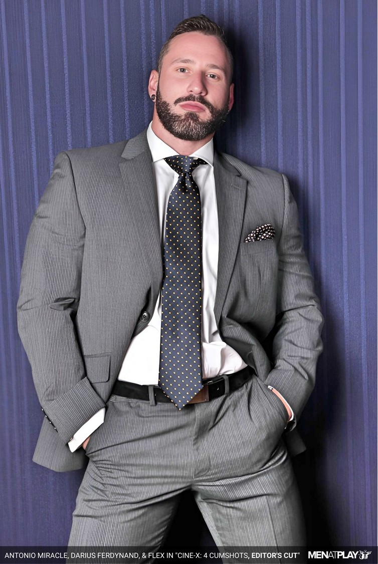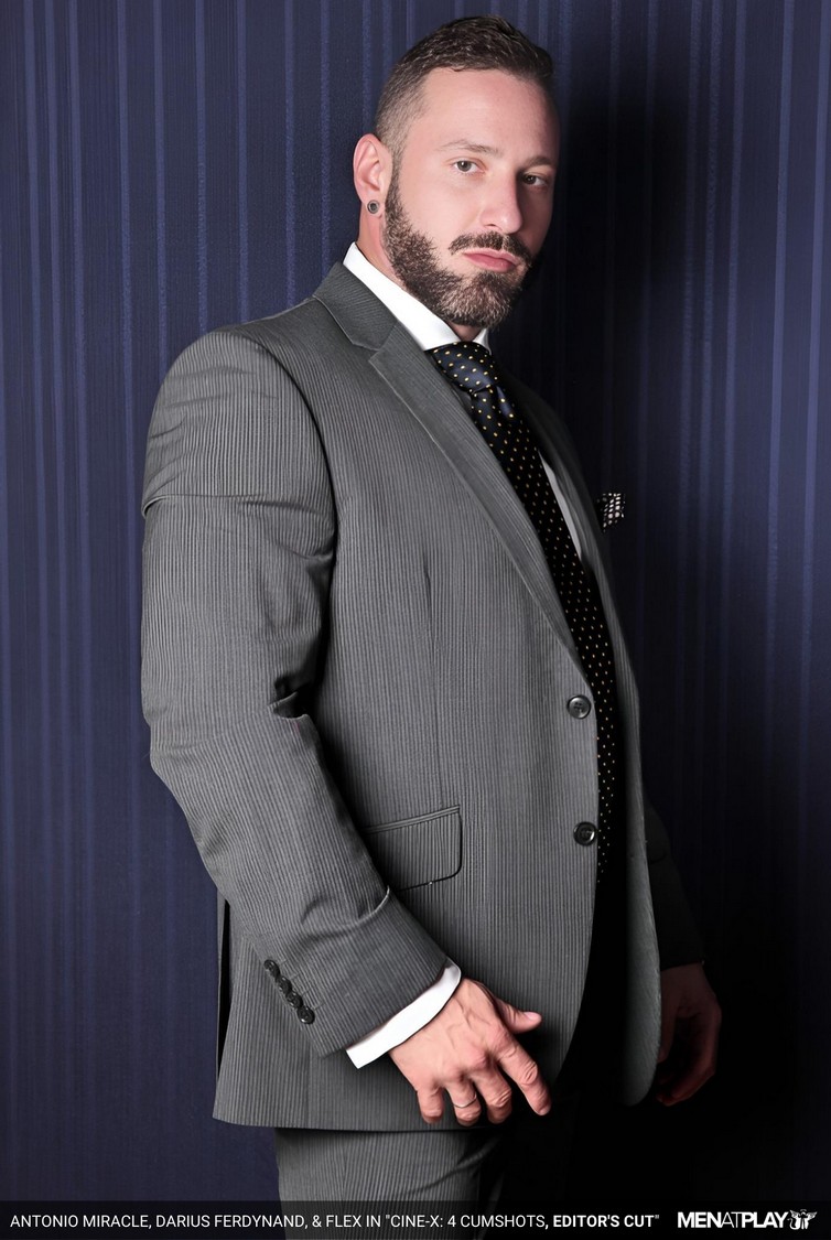 Many suited and naked men have enjoyed some sleazy fun in the Menatplay Cine-X cinema. This time, Darius Ferdynand is back at Cine-X to get his holes filled from both ends by Antonio Miracle and Flex. At Cine-X, butt-naked Darius sucks off the impeccably dressed Flex, while sleazy daddy Antonio Miracle watches from a distance. Antonio jerks off while Darius rides Flex’s cock as he sits in the cinema seat. Just the sight of that is enough to make Antonio shoot his first load. But that’s not the end for the horny Mr. Miracle, as he joins the two studs. He licks out Darius’s hole and then fucks him while Darius continues to suck Flex. The three men cum all over Darius’ perfect pecs.