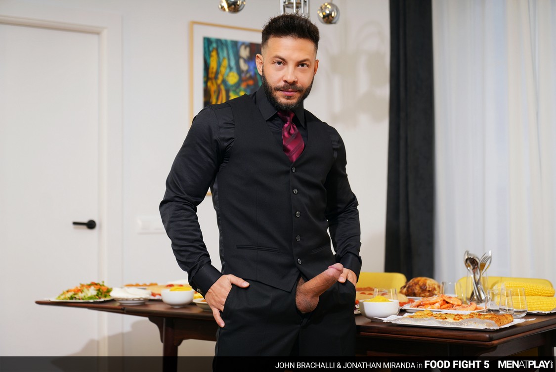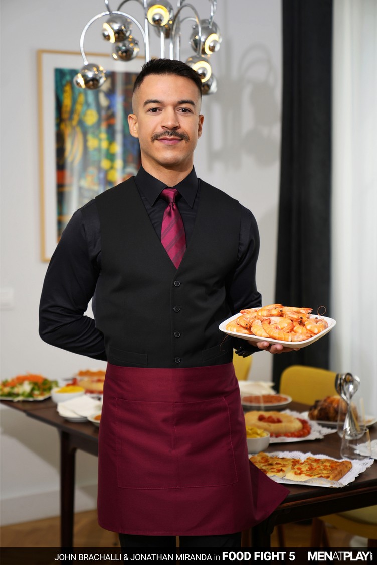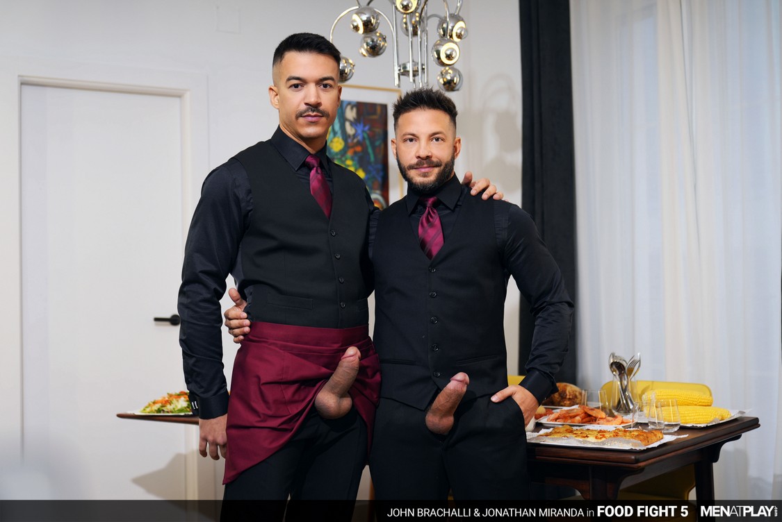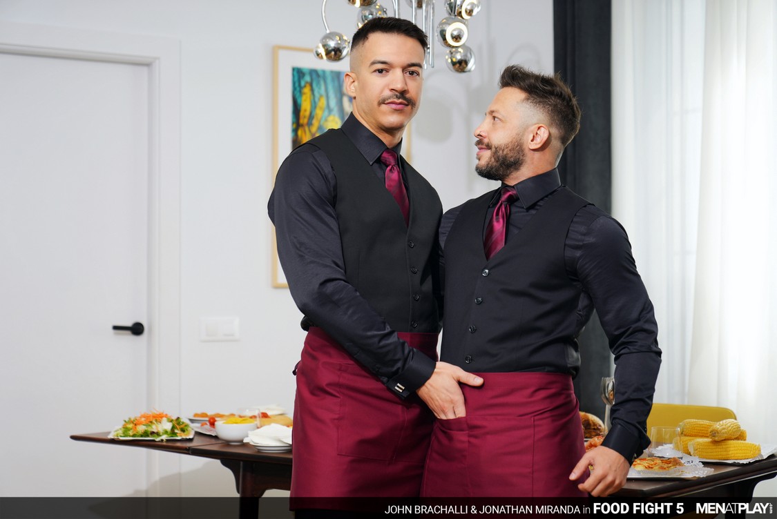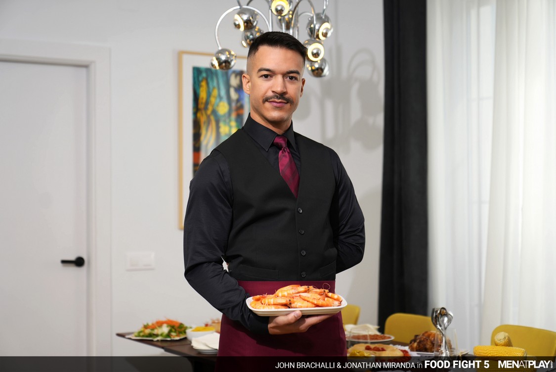Are you ready for Menatplay’s messiest Thanksgiving Food Fight, ever?! The Smith family is hosting a holiday dinner with friends and relatives, and to keep things smooth, they’ve hired a catering team to handle the meal. John Brachalli and Jonathan Miranda are in charge of setting the table, and John has a very particular way of doing things. While Jonathan’s bringing over a bowl of Dijon mustard, he accidentally bumps into John — sending mustard flying all over his uniform. Not thrilled about the mess, John snaps and starts a full-blown food fight. First, he dumps a salad on Jonathan’s head, then follows up with a splash of spaghetti sauce and pasta, turning the dining room into a chaotic, saucy battlefield. Silly banter turns to passion, and both studs get the perfect dessert – eating out ass and sucking on food-covered cocks before Jonathan shoves his thick cock inside John’s hole and fucks him raw. Maybe next year we’ll plan on doing dinner ourselves?! Bon Appetite.