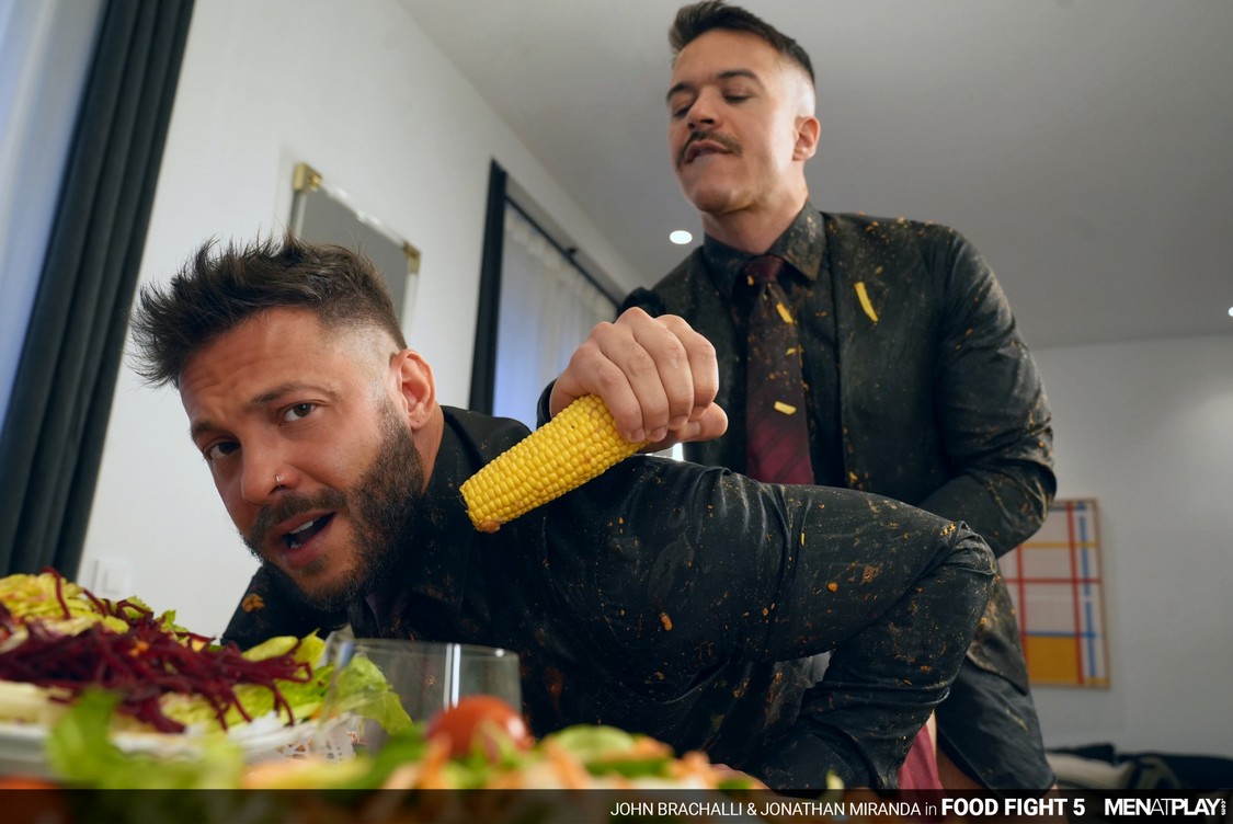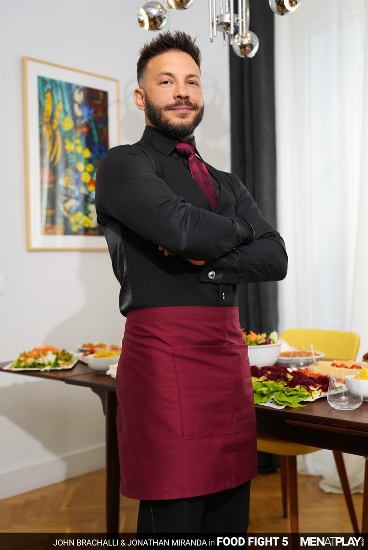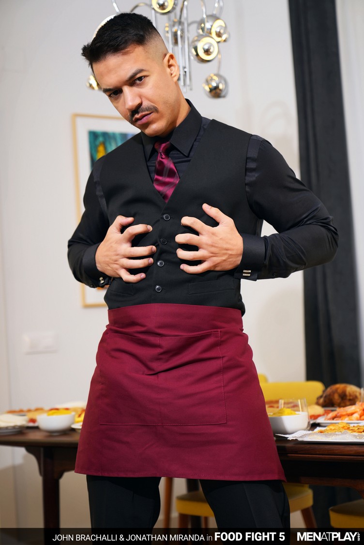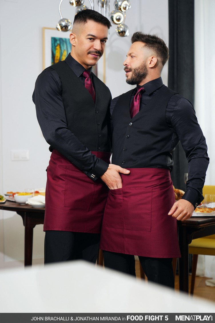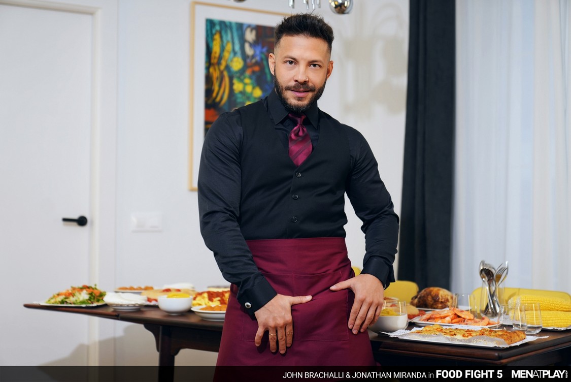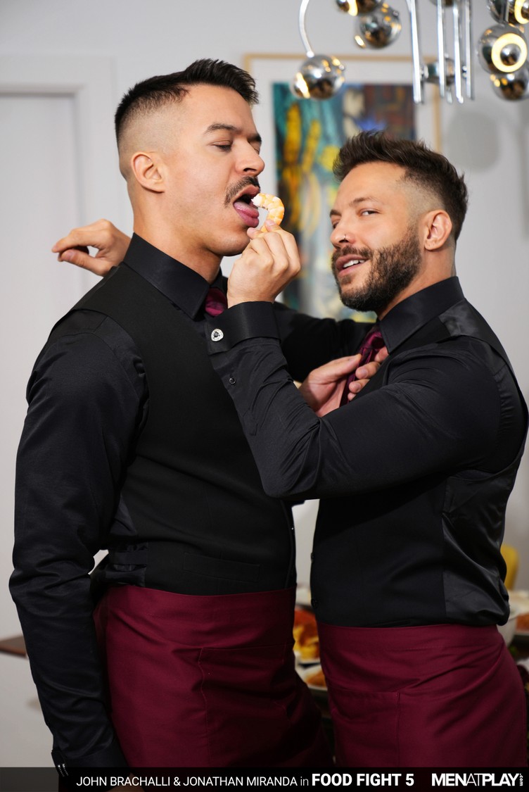 Are you ready for Menatplay’s messiest Thanksgiving Food Fight, ever?! The Smith family is hosting a holiday dinner with friends and relatives, and to keep things smooth, they’ve hired a catering team to handle the meal. John Brachalli and Jonathan Miranda are in charge of setting the table, and John has a very particular way of doing things. While Jonathan’s bringing over a bowl of Dijon mustard, he accidentally bumps into John — sending mustard flying all over his uniform. Not thrilled about the mess, John snaps and starts a full-blown food fight. First, he dumps a salad on Jonathan’s head, then follows up with a splash of spaghetti sauce and pasta, turning the dining room into a chaotic, saucy battlefield. Silly banter turns to passion, and both studs get the perfect dessert – eating out ass and sucking on food-covered cocks before Jonathan shoves his thick cock inside John’s hole and fucks him raw. Maybe next year we’ll plan on doing dinner ourselves?! Bon Appetite.