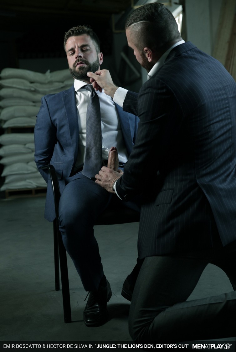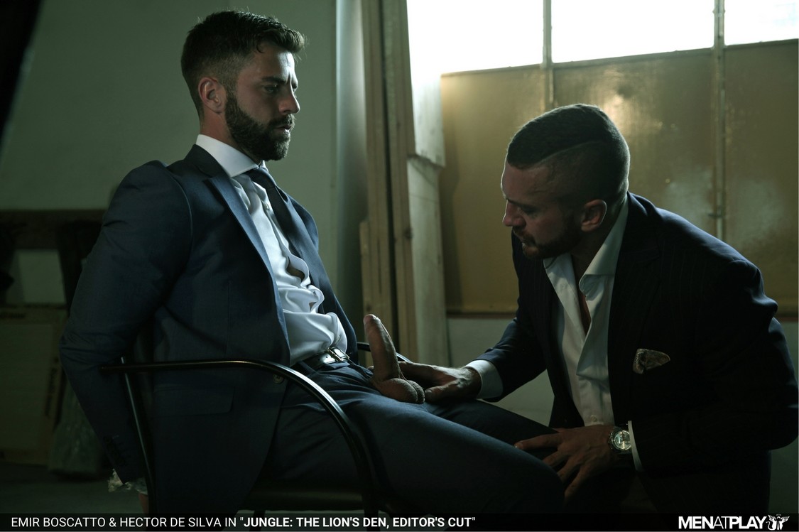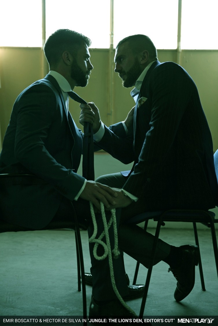 In “Jungle: The Lion’s Den,” we continue to explore the theme of dominance and submission. Emir Boscatto calls the shots today and gets his revenge on the masculine power-top, Hector de Silva. Hector finds himself entirely at the mercy of another man, bound to a chair and on the receiving end of anything Emir wants to do to him. For starters, Emir decides to play a little game of control on Hector. He takes Hector’s throbbing cock and plays with it; slowly at first, but gradually picking up the rhythm. Emir takes him to the point of almost cumming, but stops just in time to see Hector gasp, and his eyes beg him to take him to full orgasm. Emir continues this delicious game of edging a few more times, reveling in the power he exerts over the green-eyed, Spanish heart throb. As much as Emir would like to milk him fully and drink his load, this power game has only just begun!