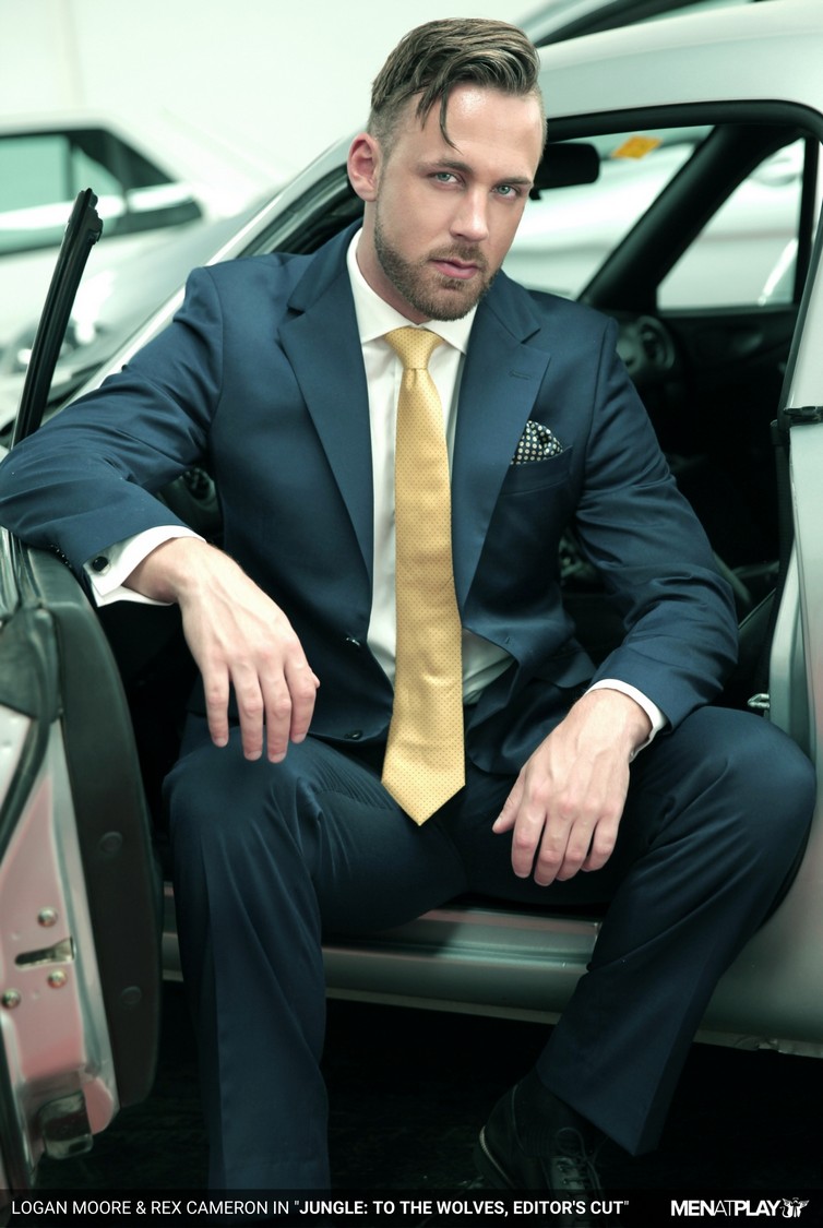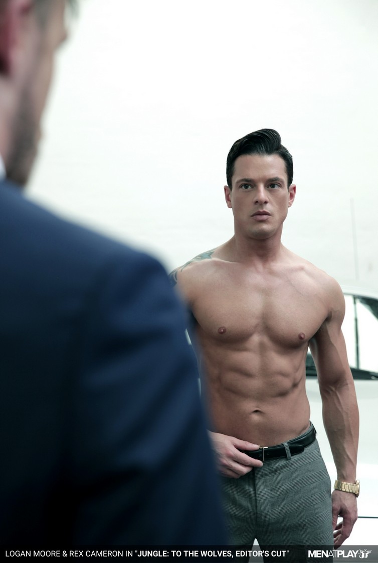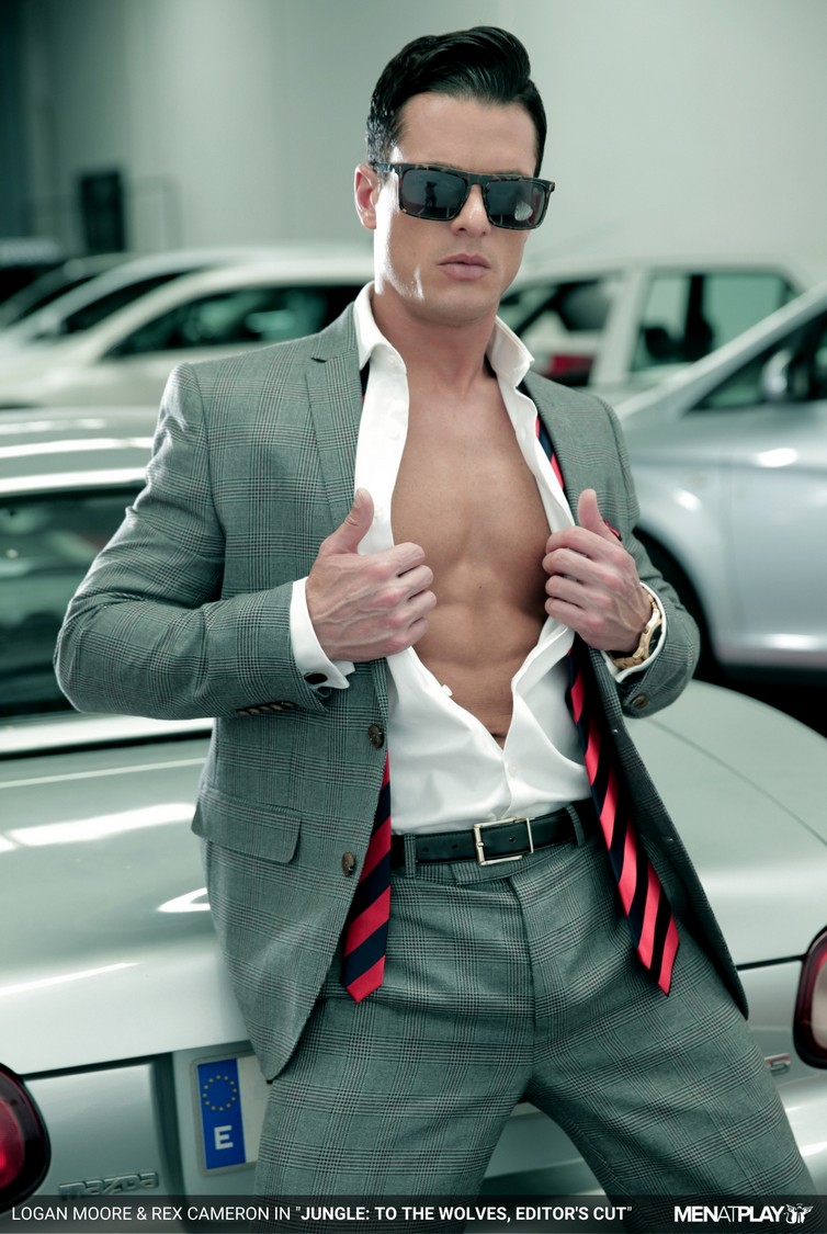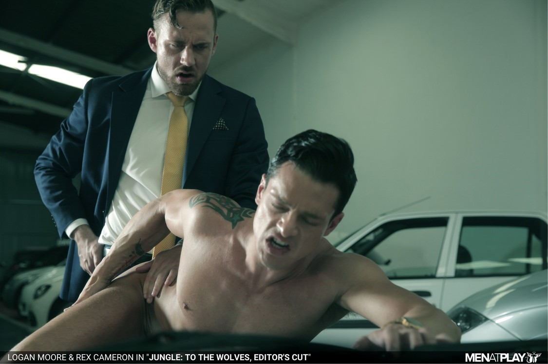 Power play, dominance, and submission are the order of the day. In the mob underworld of suited rivals, men face off, either using their masculine power to get what they want or submitting themselves to be used when they realize they’ve met their match. Cocky, slick-suited Rex Cameron turns up for a clandestine meeting in an abandoned car warehouse. Expecting to meet fellow mobster Hector De Silva, Rex is instead confronted by Logan Moore, who informs him that Emir Boscatto is dealing with Hector. Logan frisks Rex for weapons and orders him to strip right there in front of his silver sports car. Rex does not ask questions or protest; he knows his place in this showdown. He stands exposed with his perfect pecs and ripped abs on display, awaiting his fate. Rex, now vulnerable to the fully suited mobster Logan, is pushed down to his knees to prepare his cock for what is to come. After a good amount of deep-throating, Rex is spun around onto the hood of the car for cool, collected Logan to tongue and fuck his hole, making Rex howl. It’s a jungle out there, but Rex has proved himself and earned his place in the pack!