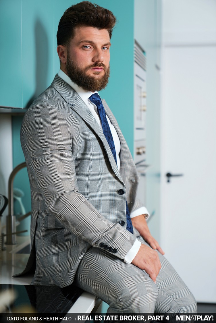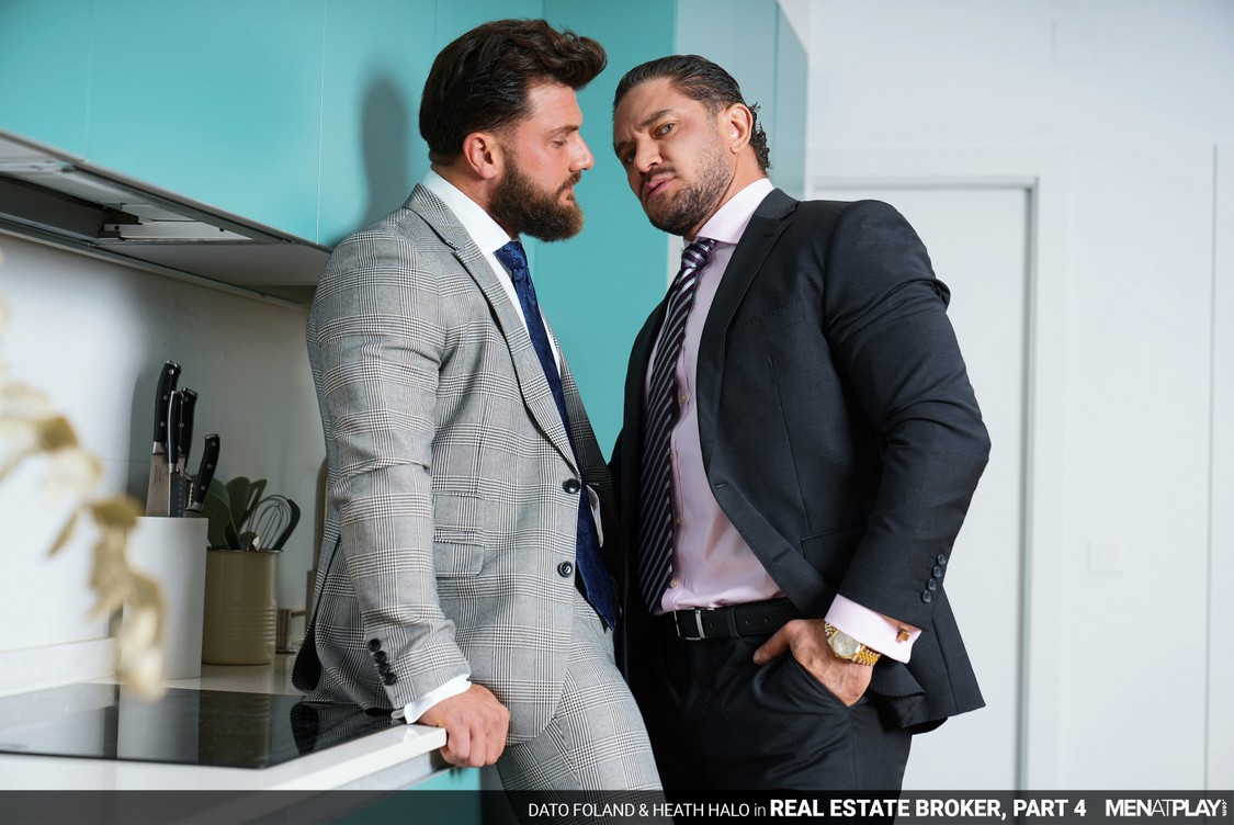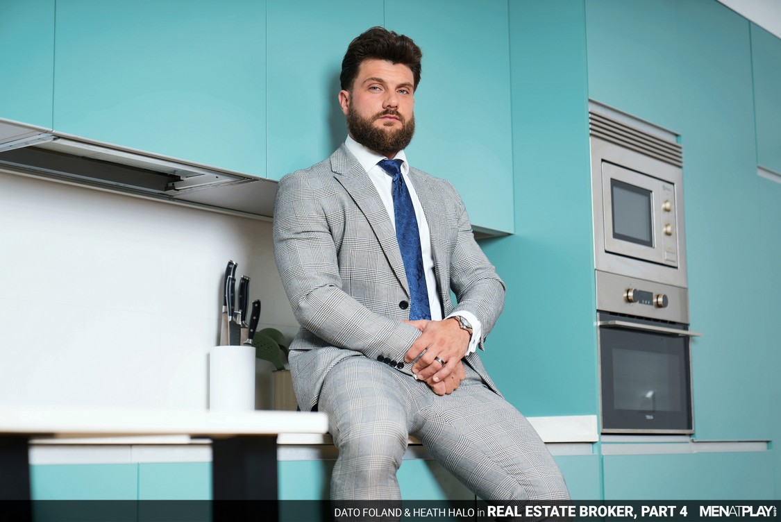 Even though it’s currently a seller’s market, Real Estate agent Dato Foland has just closed on a hot new property for his client and buyer, Heath Halo. As is customary, they are doing a final walk-through, where Heath expresses his gratitude for Dato’s service. The homeowner is ready to enjoy his new pad right away and invites his sexy agent to a private housewarming party right now. Dato is confident he understands, but still asks Heath what he has in mind. Heath slowly approaches Dato, grabs his crotch, and tells him.. “I reckon I can start here.” Passionate kissing leads to mutual cock sucking, and Dato eating Heath’s hairy hole until he pulls his legs over his shoulders and fucks his client raw. The fantastic feeling of having Dato’s big, uncut cock inside him is too much to resist, and Heath cums all over his floor while getting fucked, and afterwards, Dato pulls out and cums all over Heath’s bearded face. Closing Deals, Opening Doors (and Holes).