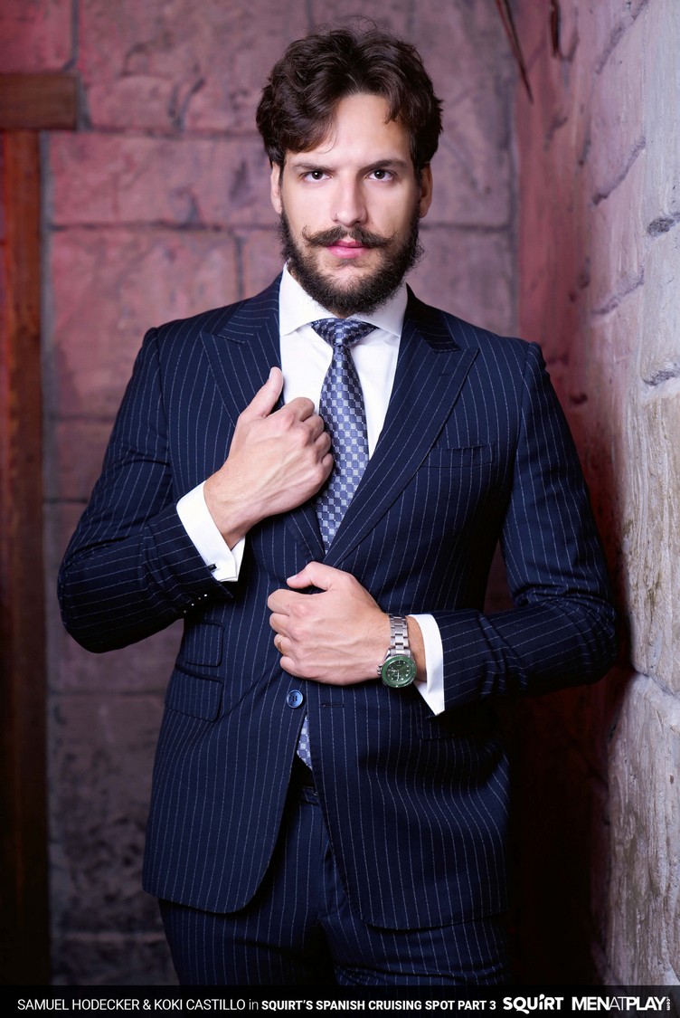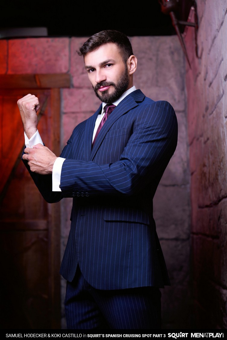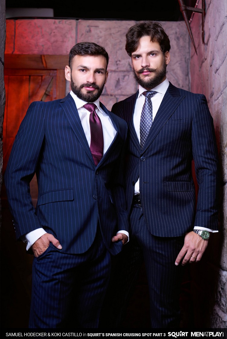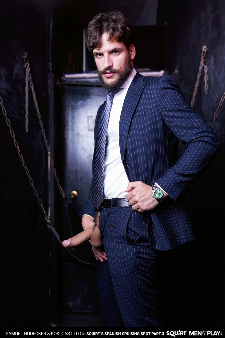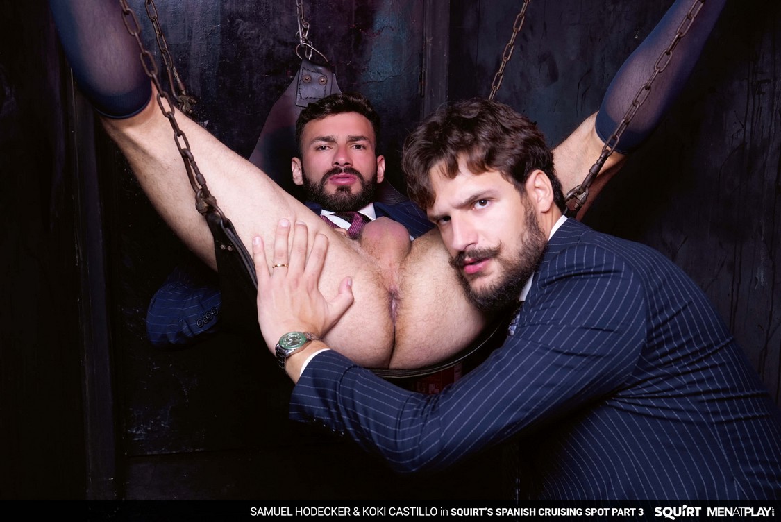 The transition to Autumn, with cooler temperatures and changing leaf colors, has Samuel Hodecker feeling horny and ready to play anonymously. He logs in to Squirts’ cruising section and is introduced to Exxxtreme, a local cruising club of pleasure and debauchery in Malaga. Here, the body rules, play is free, and the night has no rules. Inside Exxxtreme, Koki Castillo is already roaming the halls looking for someone to play with, and makes eye contact with Samuel. They ”meet” through a gloryhole – Samuel sticking his XXL Brazilian, uncut cock for Koki to service. It’s a big piece of man meat, but Koki deep throats it like only a professional cock sucker can. The hot stud Koki pokes his hairy ass into the glory hole and has it rimmed by Samuel. Then the extra big dick gloryhole meetup turns to raw fucking with Koki riding Samuel’s cock deep. The stunning Koki gets on a sling and continues receiving an ass-pounding from Samuel’s hard cock before getting showered with their hot, tasty cum.