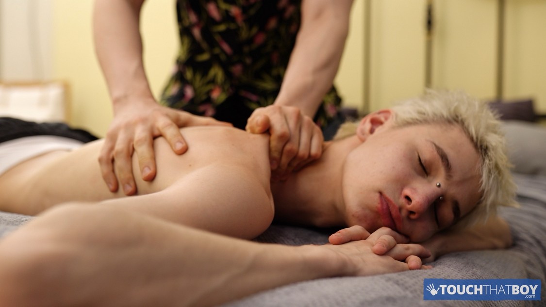 Andrew Abbott is more than happy to massage his cute friend, Dean Slim, and begins by working his hands over the twink’s shoulders and back. It doesn’t take long for Andrew to work his way lower, and once he’s peeled off Dean’s underwear, he begins lovingly massaging the boy’s smooth ass. As Dean relaxes and enjoys the warm hands on his butt-cheeks, Andrew sets his sights on the twink’s tight pink hole. He slides one finger deep inside, making Dean moan in pleasure, then uses two fingers to really stretch that hole open. By now, Dean’s uncut cock is rock-hard, and Andrew starts giving it a much needed massage too. He strokes that long cock with his hand, then uses his mouth to give his cute friend some orgasmic oral attention. Andrew can’t help getting hard as well, and so he pulls out his own uncut cock and stands just behind Dean with his balls hanging down onto the twink’s face. Dean greedily sucks and licks those heavy balls as he pumps his own cock, and a few good strokes soon has Dean firing a big load of cum all up himself. The slim twink continues to lick Andrews balls and shaft for a moment as he lays in bliss, then gets a kiss from his sexy masseur to end the session.