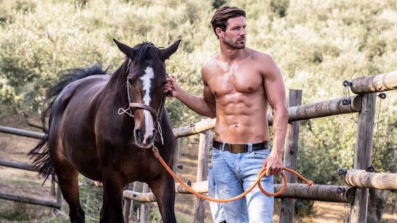 Athletic Guy Shirtless in Jeans with a Horse