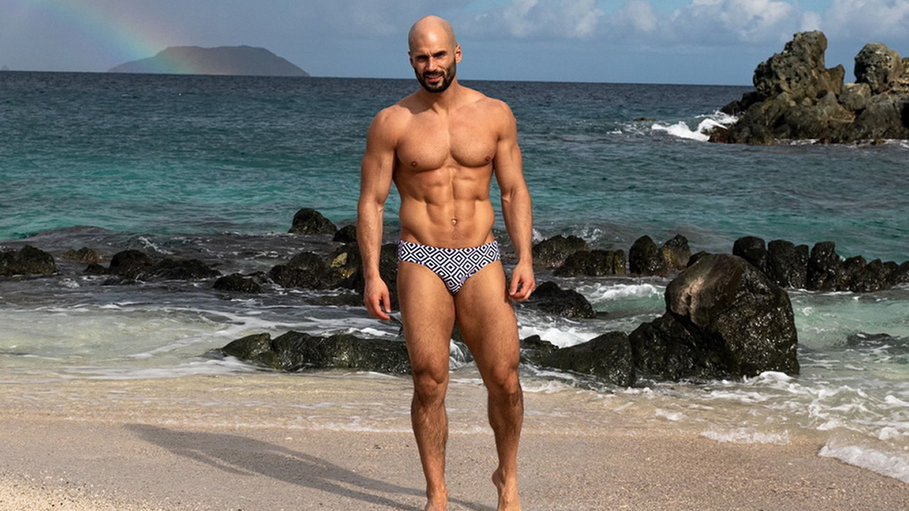 Athletic Hunk in a Black and White Bikini at the Beach