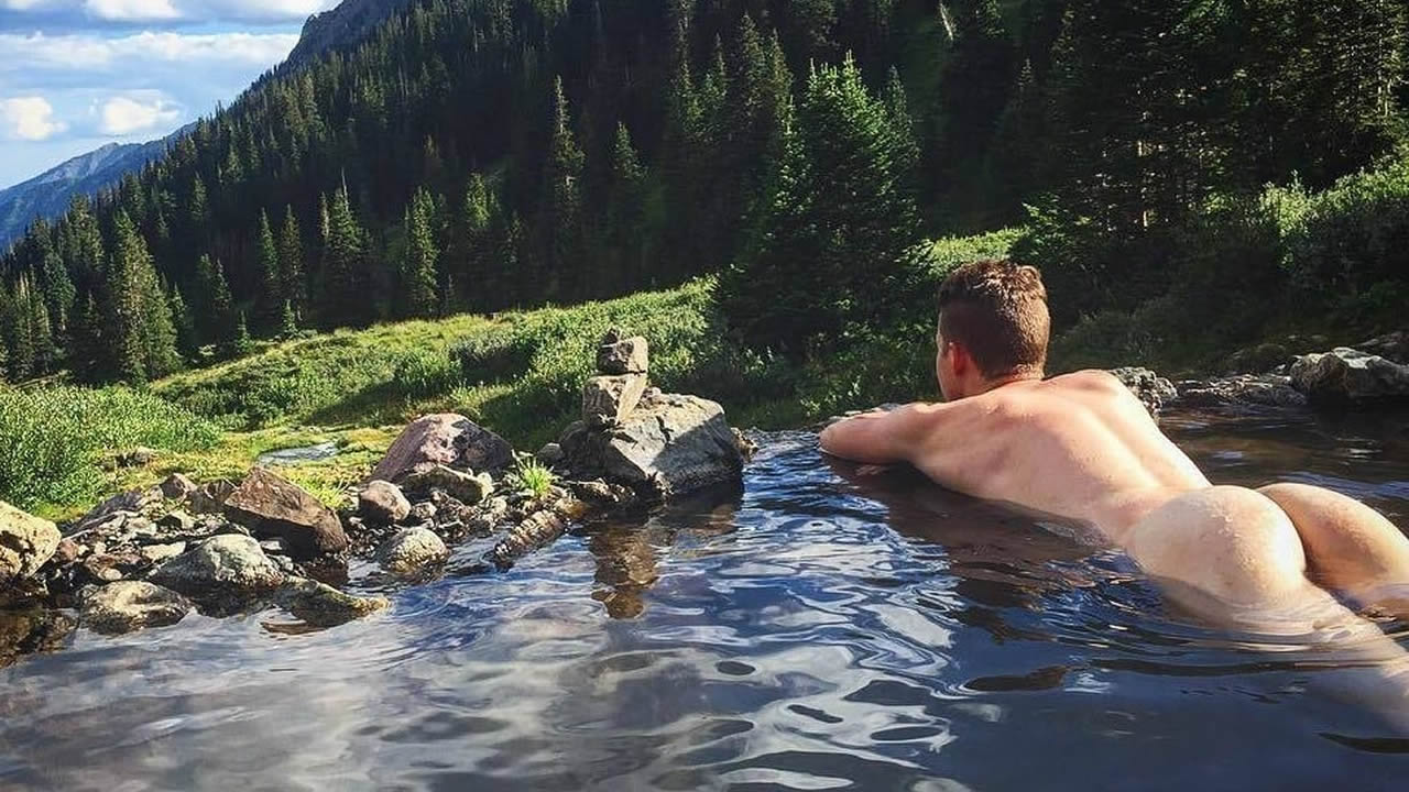 Rearview Naked Guy in a Mountain Stream