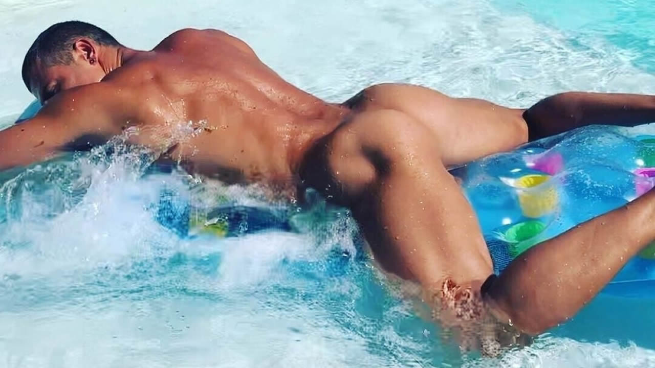 Rearview Naked Hunk Floating in a Pool